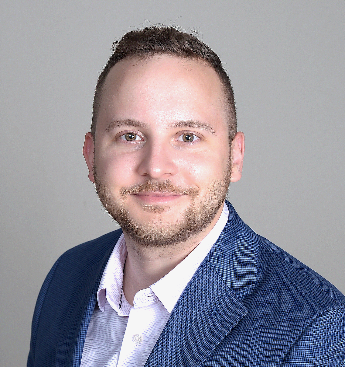 Headshot of a man with short brown hair, a beard, wearing a blue suit jacket and a white dress shirt, smiling against a plain gray background.